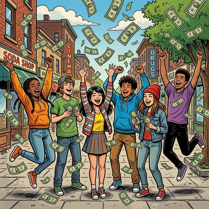 A lively group of teenagers expressing joy as they stand outside, enveloped by floating dollar bills. The image is inspired by key characteristics of the Pop Art movement, with vibrant colors and bold outlines prominent in the scene. Each teenager showcases a unique pose and expression that conveys their enthusiasm and excitement. The style of the image is consistent with that of digital painting, paying homage to the comic book aesthetic prevalent in art prior to 1912.