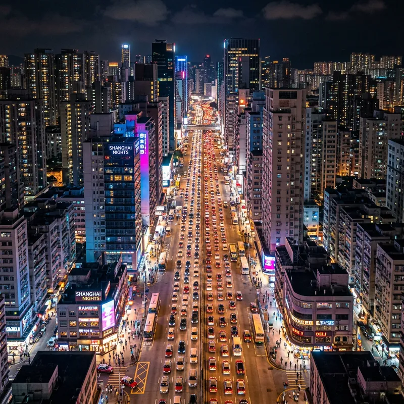 An aerial shot from a drone showcasing a busy cityscape. Imagine a long line of cars lined up bumper-to-bumper, illuminating the setting with vibrant neon colors. The scene is abuzz with life, encapsulating the hustle, bustle, and vigor of modern urban life. Tall buildings line the streets, housing lights in the windows representing the lives within. Streets are bustling with activity, the aerial point of view adding depth to the vivid colors and dynamic city life.