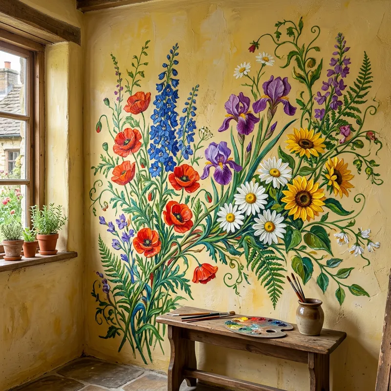Visualize an oil painting illustration of a neutral-toned yellow wall which carries a juxtaposition of vibrant wildflower mural. The flowers should comprise of bright red poppies, deep blue delphiniums, radiant purple irises, dazzling white daisies, and sunshine yellow sunflowers. The leaves and stems should be in various shades of lush green. All the flowers are intertwined together in an elaborate, artistic design, forming a lively mural that further accentuates the yellow wall.