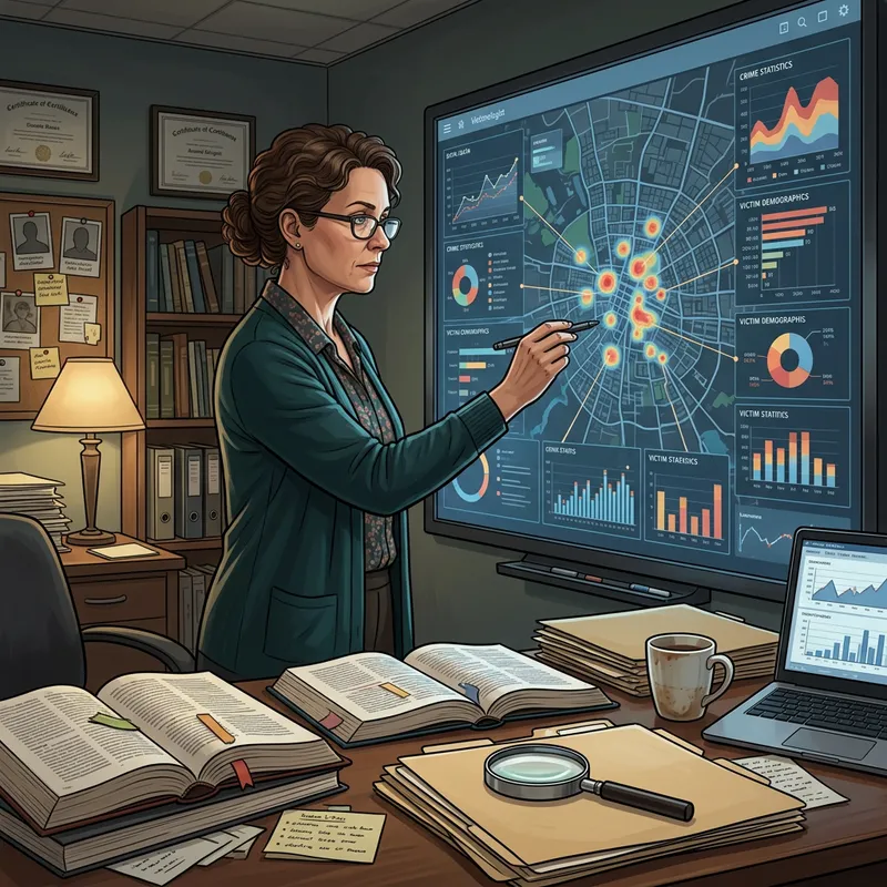 This is an illustration of a victimologist who is a professional assessing the harm experienced by victims of crime. This person is a middle-aged Caucasian woman with brunette hair organized in a tidy bun. She is observing a digital map on her wall-sized interactive screen. Her room is filled with several open books, case files scattered on her desk, a magnifying glass, and a cup of coffee. Her expression is serious, reflecting the gravity of her job, and she's studying every detail with utmost concentration.