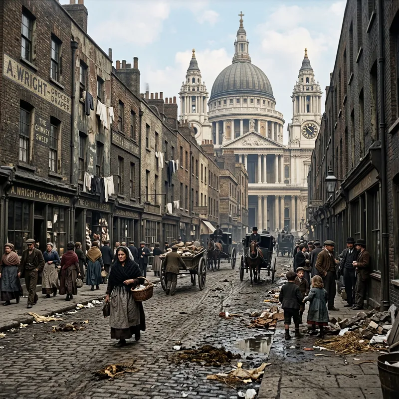 A daytime scene of a Victorian-era cobbled street in London. The road is portrayed as unclean, hinting at the poorer part of the city, with signs of scattered debris and signs of wear. In the background, the majestic St. Paul's Cathedral stands tall, its beautiful architecture contrasting with the surrounding environment. The Cathedral's iconic dome and spires are easily recognizable, radiating in the soft light of the day.
