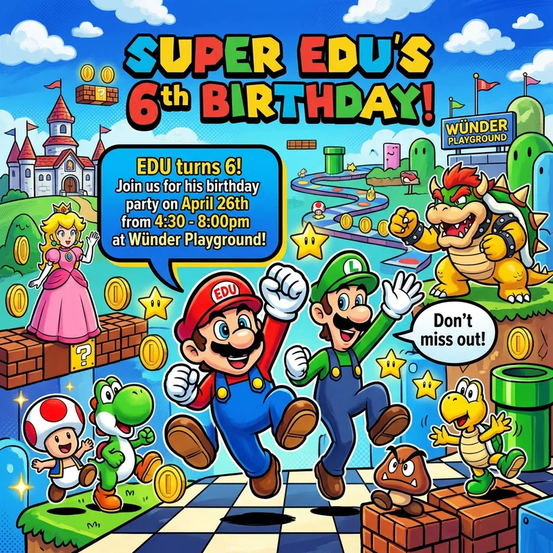 Create a lively and colorful digital painting of a video game-themed birthday party invitation. The scene should be inspired by classic video game characteristics, featuring a variety of friendly characters in dynamic poses. The main characters include a plumber-like hero in red and blue, a tall sidekick in green, a princess figure, a grimacing brute, and other various fun-like creatures. The background should resemble platforms and environments from beloved old video games. The art style should mimic comic books with bold outlines and vibrant colors, injected with a playful and nostalgic atmosphere. Use a digital-looking wide-angle perspective to encapsulate the entire scene. The details of the event are embedded in speech bubbles: 'Edu turns 6! Join us for his birthday party on April 26th from 4:30 - 8:00pm at Wünder Playground! Don't miss out!'. The dominant color should be blue, representing the iconic aesthetic of these classic games.