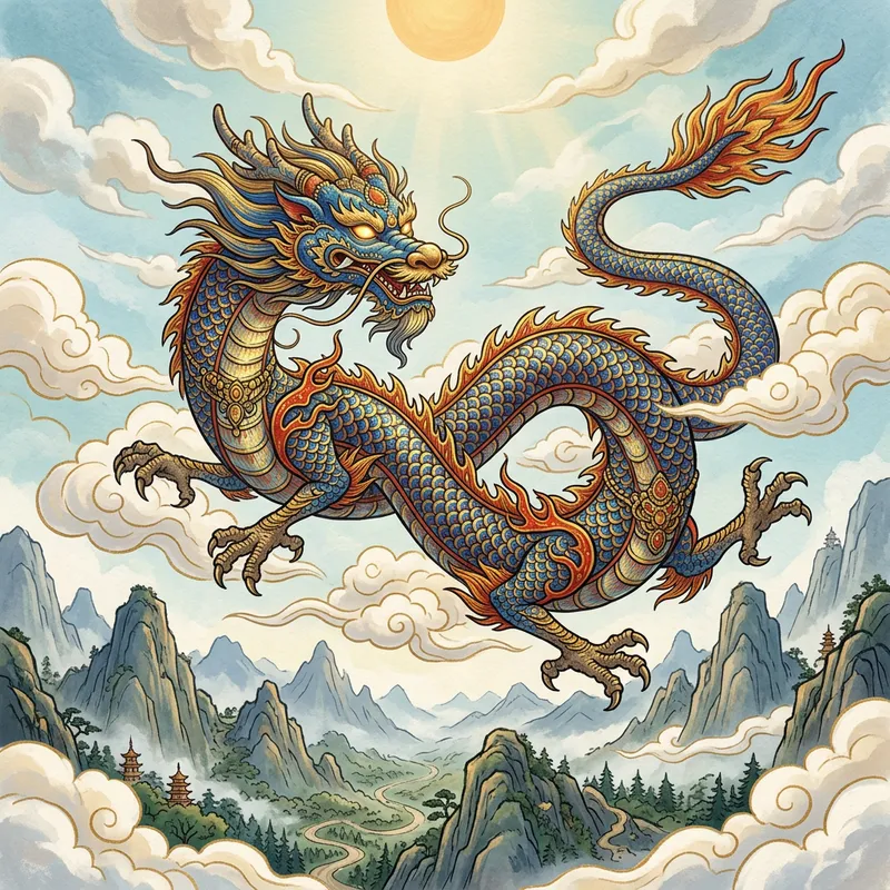 Vietnamese Dragon 'Lân' Soaring in Serene Sky