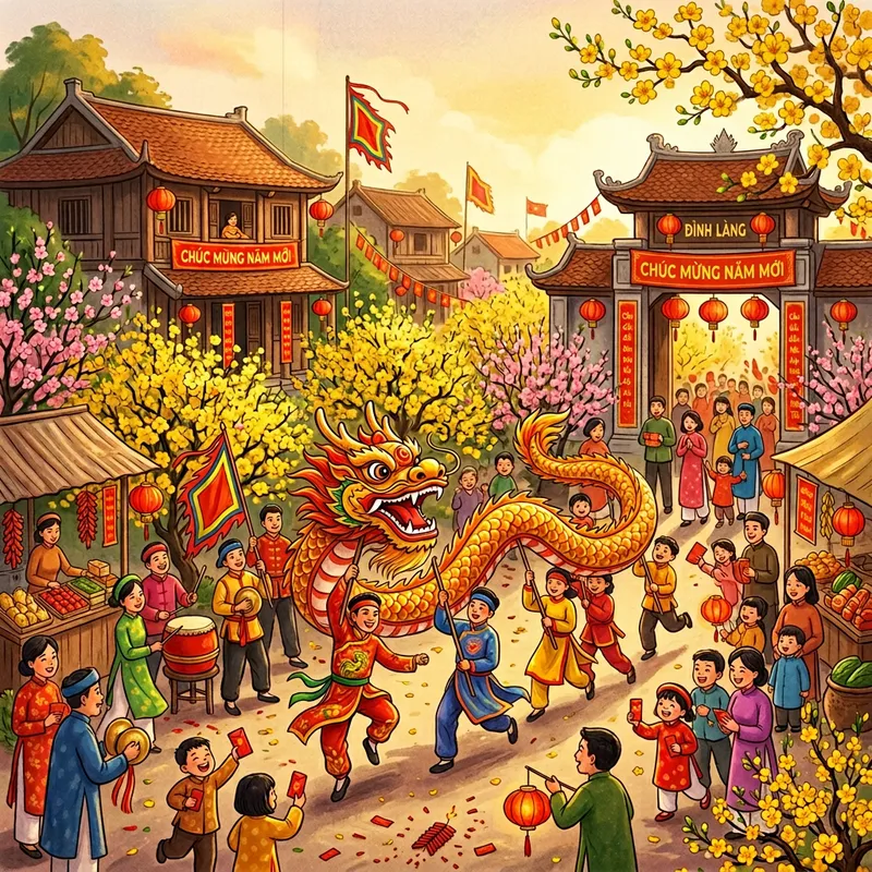 An illustration depicting a traditional Vietnamese Tet festival. The image captures the vibrant display of cultural heritage in a soft, warm light as if taken by a vintage film camera. In the foreground, a lively dragon exudes the joyous spirit of the celebration, dancing amidst a backdrop of bountiful apricot tree gardens. The balance of revelry and tranquility enhances the ethereal charm of the scenery.