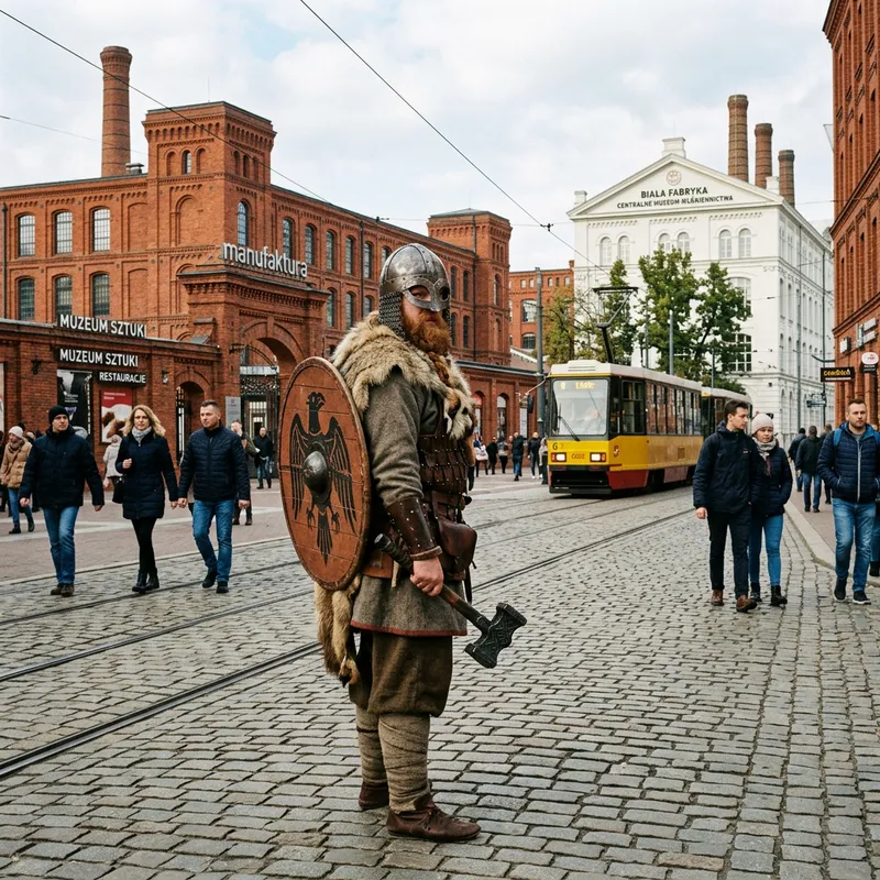 A scenery depicting a traditional Viking in the city of Lodz. The Viking is robust with a red bushy beard, equipped with a wooden shield and an iron hammer. The background is filled with notable landmarks of the city, including the Manufaktura, a historical cotton factory turned into a cultural and shopping centre, and The White Factory, a classic 19th-century textile mill. The city's traditional red-bricked buildings and cobblestone streets are peppered throughout the scene. The Viking appears as if he's time-traveled, creating a whimsical juxtaposition between the ancient and the modern.