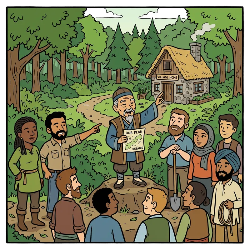 The scene unfolds in a densely wooded forest where a diverse group of villagers is congregated around a quaint little house. Engaged in a fervent conversation, some villagers are pointing towards the house while others are in deep thought, expressing their contemplation over the imminent task. An elderly figure, an Asian man wearing traditional garb, wisdom etched onto his face, steps forth. With informative gestures, he shares his strategic plan. The villagers, a mix of Caucasian, Hispanic, Black, Middle-Eastern, and South Asian men and women, hang on to his every word, their faces a blend of resolve and expectation. The style should be akin to a simplistic, cartoonish comic strip, easy to draw and comprehend.