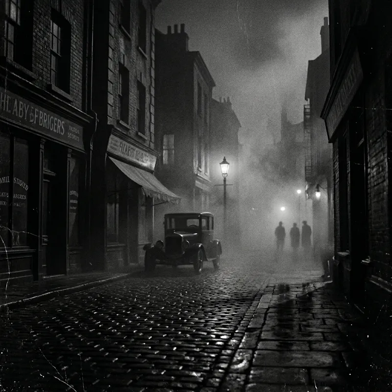Film Noir style image of the 1920s depicting three shadowy figures in the far background of a mysterious and fog-filled dimly-lit street. The individuals, unseen and concealed by the thick fog and the veiling darkness, convey the suspenseful ambiance typical of the era. The dense fog and shadows enhance the enigma, making their facial features indistinguishable, while the vintage surroundings hint at the bygone era. The street appears deserted and eerily silent, with only the soft muted echo of the unseen figures providing a sense of life.