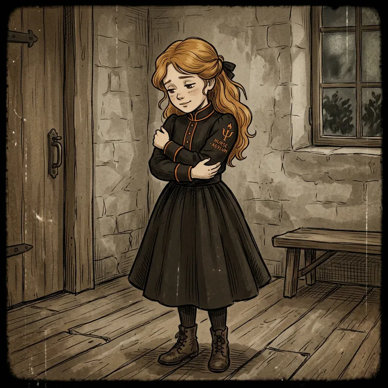 A girl in the style of pre-1912 animation, with honey-colored hair and brown eyes, wearing a black psychology nurse uniform with orange detailing, hugging herself.