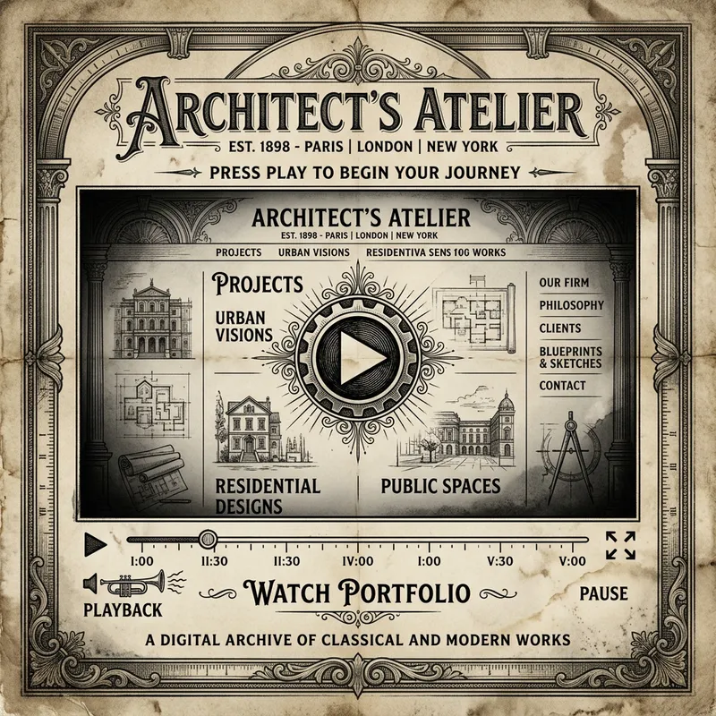Create an image showing a vintage black-and-white poster. The scene represents the splash screen of a 16:9 aspect ratio video player, displaying the interface of an architect's website. The visual representation should comprise stylistics of vintage prints, with chiaroscuro lighting techniques and intricate details, suggesting a sense of old-world charm. Use the method of digital painting with softened brush strokes to imitate the coarseness of aged paper and to give an impression of antiquity.