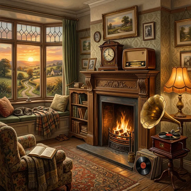 A comforting and nostalgic setting of a room filled with vintage artifacts: an antique wooden clock on an oak mantel, a retro radio playing melodious tunes, an old gramophone sitting in a corner with a vinyl record next to it, and a warmly lit lamp with a fringed shade. The room also features a bay window which displays a peaceful rural landscape, bathed in the soft light of a setting sun. The image draws inspiration from the realistic touch of the 19th-century art characteristics such as detailed textures and earthy colors.
