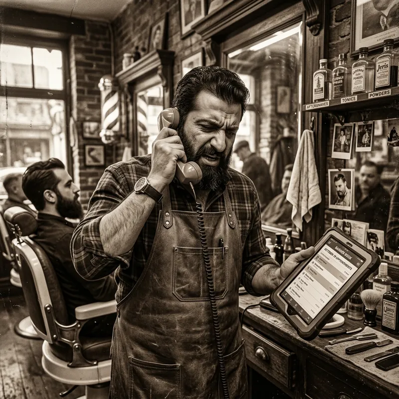A vision of a scene inside a vintage-style barbershop. In the frame, a Middle-Eastern male barber brims with frustration, simultaneously juggling phone calls for appointments with one hand. On the other hand, he's nonchalantly browsing through a Barber Book on a tablet. His expression is a study in contrast, paired with the relaxed and the chaotic vibes of his duties. The image is treated with a vintage-inspired filter, intensifying the already evident sepia tones and dramatically illuminating the tight framing of the subject. Atmospherically reminiscing the style of late 19th-century street photography.