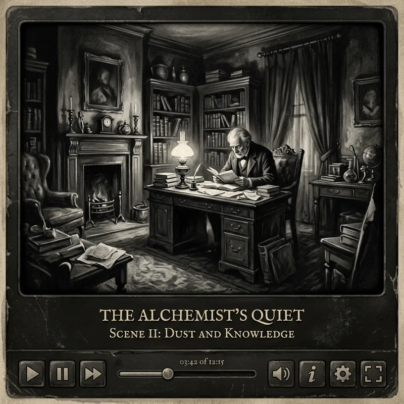 A vintage black-and-white digital painting in 16:9 aspect ratio, featuring a video player interface with navigation buttons. The scene contained within the video player shows an intricately detailed interior under chiaroscuro lighting. The overall image brings to mind the aesthetics of antique prints, with a generous use of soft brush strokes and monochrome palette.