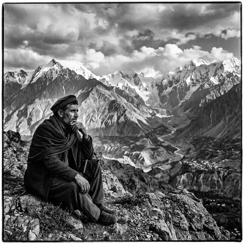A majestic mountain landscape with a foreground of a South Asian man's portrait, captured with the aesthetic of a vintage film camera. The image is inspired by the sweeping black and white landscape photography prevalent in the early 20th century, highlighting dramatic lighting and contrast. The man in the portrait takes on a contemplative pose, further adding to the scene's depth. The image also features prominent film grain to give it an evocative, medium format feel, all the while capturing the serene beauty of scenic nature.