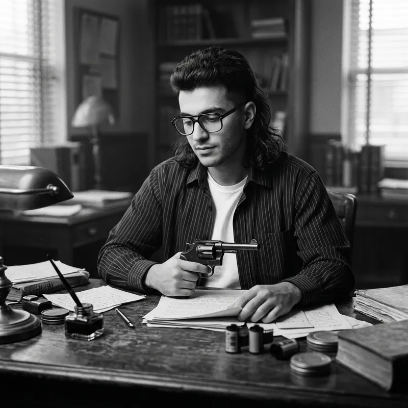 A 20-year-old Middle Eastern man sporting trendy glasses and a mullet hairstyle. He's wearing a striped shirt and is situated behind a vintage wooden desk strewn with papers. In his hand, he holds an old-fashioned revolver. The entire scene is depicted in stunning black and white, imbuing it with an air of timeless elegance and suspense.