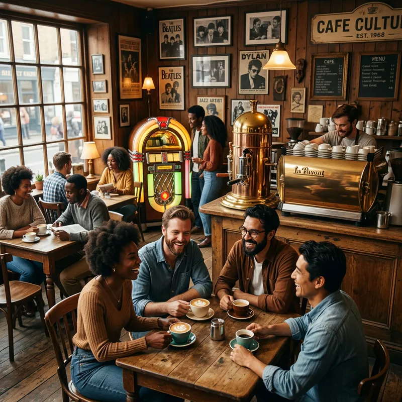 Depict the rich retro aesthetic of Café Culture. Include elements such as vintage espresso machines, elegantly served cups of coffee, a jukebox playing soft music in one corner and patrons from various descents, male and female, engaged in convivial conversation. The ambience is gentle with warm lighting seeping through the window illuminating the wooden furniture and creating shadows that echo the past. Frame the scene in a dimly lit, rustic yet cozy café. The walls are adorned with antique décor items and framed pictures from the 1960s and 1970s.