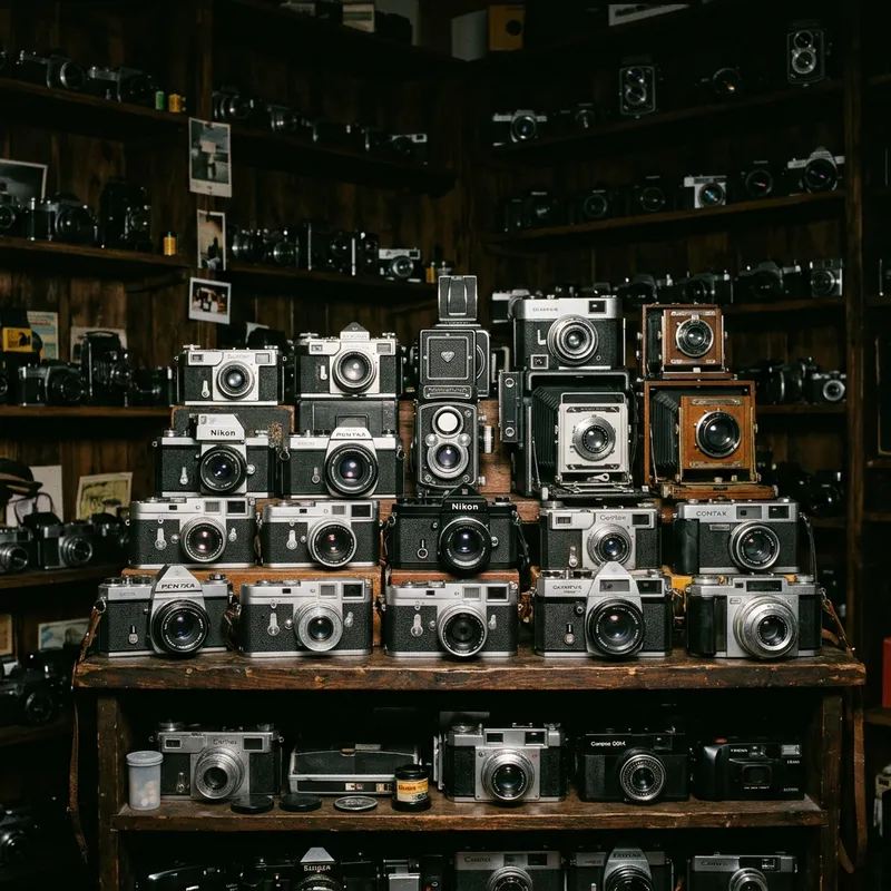 Imposing vintage cameras with various types, shapes and sizes arranged in a meticulous display, illuminated by a striking flash of light, producing a charismatic chiaroscuro effect.