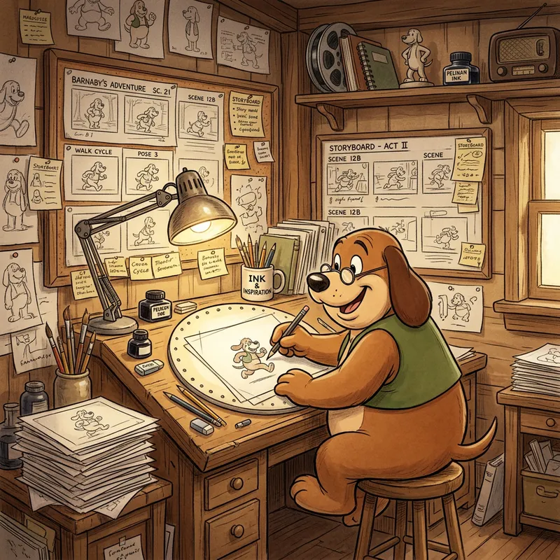A chubby dog cartoon with a vintage animator's touch. The dog has a cheerful demeanor, surrounded by its sketches and drawings. It is placed in a traditional animator's work station filled with storyboard notes, sketches, pencils, and probably an old-fashioned animator's desk lamp. The scene should give off the creative vibes of old-school animation studios.