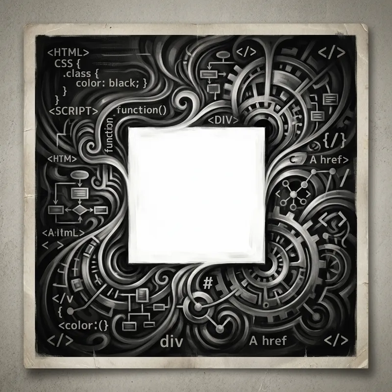 A vintage digital painting featuring a black-and-white poster. Central to the piece, there's a stark white square. Surrounding this primary element, intricate aspects of web design and symbols depicting web programming have been woven into the composition, creating an intriguing contrast with the vintage theme. Chiaroscuro lighting is employed, casting dramatic shadows and highlighting sharp contrasts of light and dark, implying depth and volume. Soft brush strokes, reminiscent of traditional artwork, add a tactile feel to the digital medium.