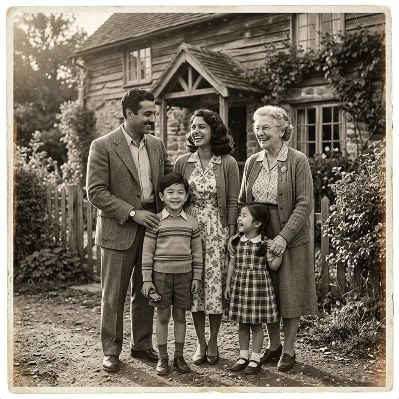 Create a vintage style black and white image of a diverse family of five, consisting of a Middle Eastern father, a South Asian mother, two East Asian children, and a white grandparent. They are dressed in 1950s attire standing in front of a rustic farmhouse, expressing candid and loving interactions. The setting features warm and nostalgic lighting to evoke feelings of a bygone era. The desired look and feel of the image are reminiscent of those typically captured with a Rolleiflex TLR camera, using medium format film. Add an aged effect with subtle film grain and sepia tones.