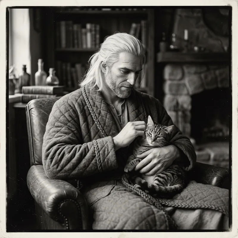 A drawn character from a popular fantasy game, wearing a comfy house robe, holding a cat in their arms. The image should evoke the feeling of a vintage black and white portrait, with the character in a relaxed pose. Use soft lighting and shadows to create depth and mood. The style should mimic the grainy texture of pictures taken with a medium format film camera, enhancing the vintage vibes of the scene.