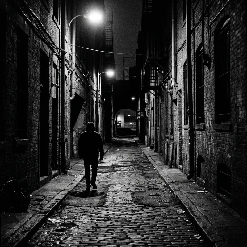 An ominous scene encompasses a lone figure, dressed in a hooded jacket, walking down an isolated alleyway. The environment is characteristic of a film noir atmosphere, hammered by long, dark shadows and luminescence pierced by dimly lit street lamps sprinkling dramatic shards of light. The entire panorama is drenched in black and white, a common theme echoed in this reminiscent vintage style. The gritty urban landscape subtly builds a crescendo of suspense and intrigue, leaving the impression of a puzzling mystery about to unravel. The image should have the high-contrast and grainy aesthetic of photos taken on a classic 35mm film camera, comparable to the effects achieved using vintage film like Ilford HP5.