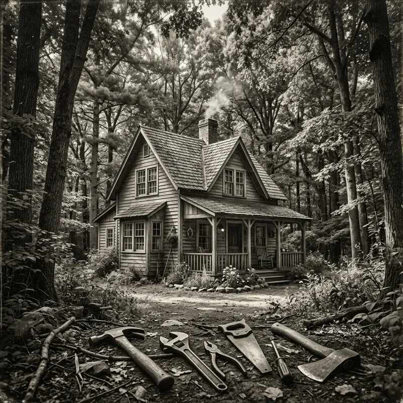 A vintage black and white image. Depict a quaint two-story house nestled amid the thickets of a lush forest. Variety of tools such as a hammer, wrench, and pliers should be strewn at the bottom foreground of the image. The house should have details such as multiple windows, a chimney, and a porch. The forest should be filled with tall, dense trees, the branches of which dapple the light filtering from above.