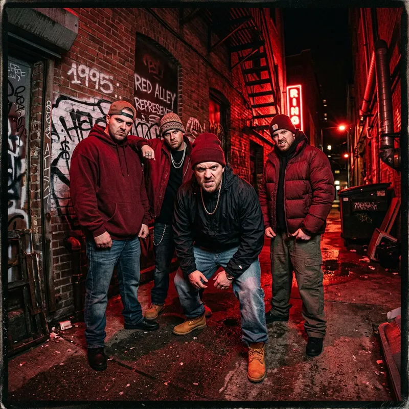 Four Caucasian men in urban streetwear, poised in a dark alleyway reminiscent of 1990's hip-hop culture. Each of them has intense facial expressions. The overall mood is heavily influenced by the high contrast style, especially through the predominant use of vibrant shades of red. The scene has been captured with a perspective similar to that of a Nikon D750 wide-angle lens for an immersive viewing experience. This composition takes inspiration from vintage gangster rap album cover art.