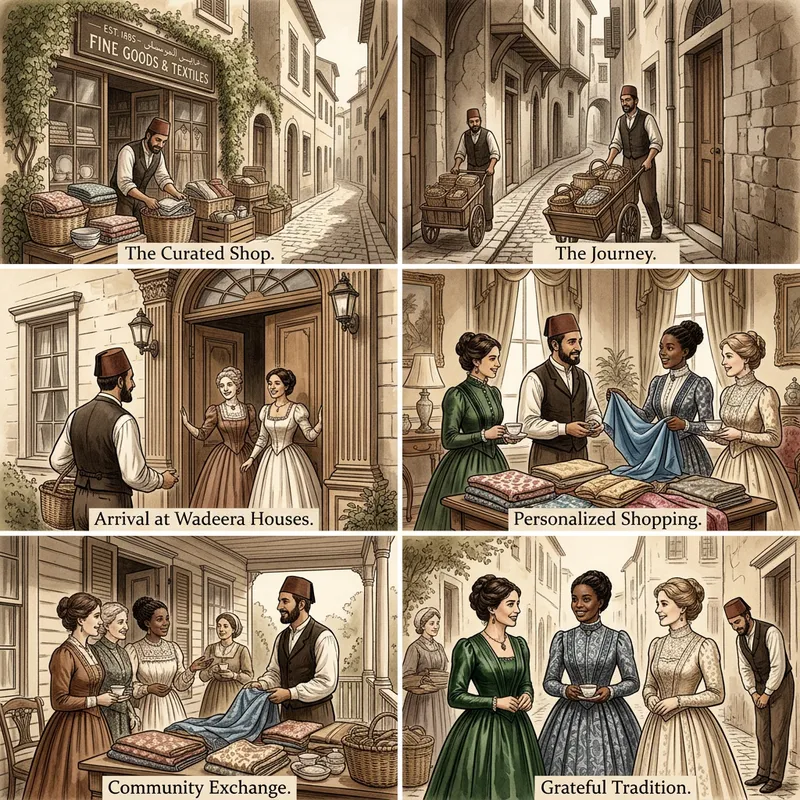 Create a visual storyboard set in a historical time depicting a cobblestone street lined with ivy-covered shops. Highlight a storefront run by a middle-eastern male shopkeeper who is known for his exceptional service. Show the shopkeeper preparing carefully curated wicker baskets and wooden crates of fabrics, garments, and household items. Show him traversing narrow alleys and winding streets to reach grand houses, the 'Wadeera Houses,' inhabited by the town's elite women of differing descents: Hispanic, Black and Caucasian. Illustrate their excitement as they await his arrival. Allow viewers to experience the intimate nature of this personalized shopping occasion as the women browse the offerings, sip tea and engage in discussions with the shopkeeper. Capture the community feel as neighbors gather to share stories amidst the exchange of goods. End with a heartwarming scene of women radiating confidence and elegance dressed in their new acquisitions, grateful for the cherished tradition of home shopping.