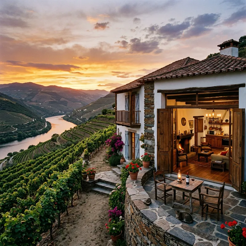 A vintage house in the style characteristic of the Douro region. The home exudes rustic charm with antique furniture and décor. It is located amidst sprawling vineyards, with the stunning Douro river flowing nearby. The exterior of the house showcases traditional Douro architecture with whitewashed walls and a red tiled roof. Inside, it's a harmonious blend of old and new with wooden beams running across the ceilings and polished hardwood floors. Modern amenities such as a well-equipped kitchen and a comfortable living room space seamlessly integrate into the antique ambiance. The evening sun casts beautiful orange and purple hues over the landscape adding a magical touch to the scene.
