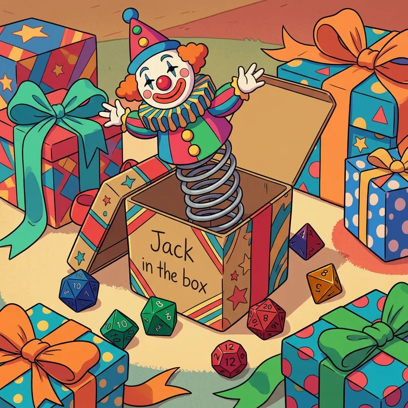 Envision a toy commonly known as a jack-in-the-box, but designed in a style reminiscent of the animation trends of the 70s and 80s, exhibiting a mainly two-dimensional appearance and a saturated color palette. Avoid referencing specific copyrighted styles, instead, focus on pulling inspiration from the era's general aesthetics such as rounded shapes, cel-shading, and clean lines. The scene should also contain dice, commonly seen in tabletop role-playing games, scattered about. There are gift boxes decorated with ribbons and patterns present as well. One particular gift box stands out, with the English words 'Jack in the box' inscribed on it. This phrase is written on the side of the box, in a simplistic, flowing script.