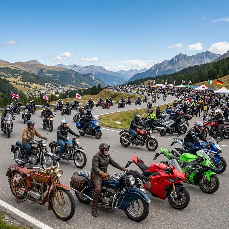 A highly detailed image illustrating an assortment of motorcycles from different eras and countries. Some bikes should be vintage models from the early 20th century, exuding an air of nostalgia with their leather seats and shiny chrome parts. Others could be modern sports bikes, their aerodynamic shapes and bright color schemes reflecting speed and technology. Ideally, there should be a healthy mix of new and old, western and eastern models. The motorcycles should be arranged on an open road under a clear sky, perhaps hinting at a cross-continental race or an international bikers' meetup.