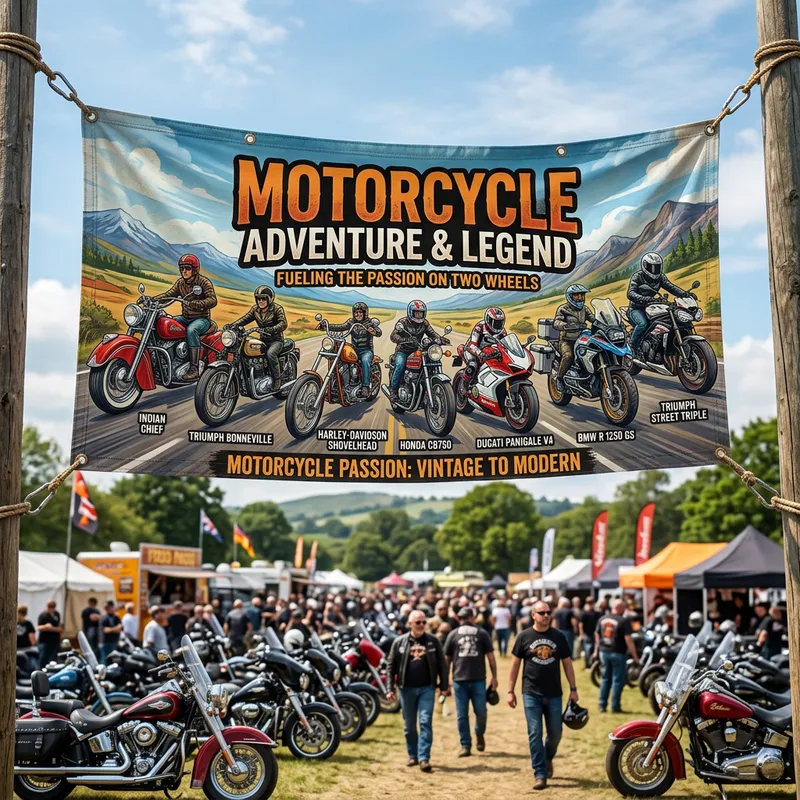 A captivating photo of a banner with the theme of motorcycles. The banner is stretched wide, showcasing detailed illustrations of various vintage and modern motorcycles. The motorcycles range from classic cruisers to sport motorbikes, each intricately designed with distinct features. This colourful banner radiates a sense adventurous spirit and passion for motorcycling.