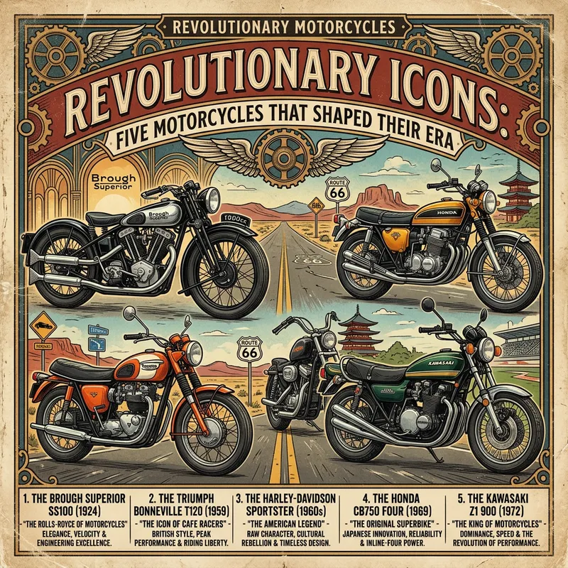 Generate a detailed illustration of five vintage motorcycles that revolutionized their era. These motorcycles should be illustrated as icons, defined by their distinctive features and era-defining designs. Please capture these models in a classic and enduring style, paying homage to the timeless aesthetic of their period.