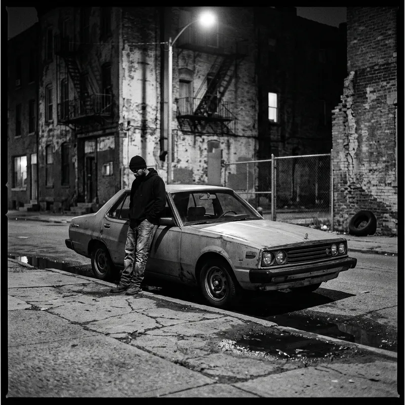 An aged Nissan Skyline is parked on a dimly lit, deserted street in a dilapidated urban neighborhood. A man, dressed in a hoodie, is on the scene. The image, captured through a timeless black and white lens typical of a classic film camera, is highlighted with dramatic lighting. Intense shadows accent the urban decay and resilience vibe. The car stands as a beacon of might amidst the worn-out surroundings, fostering a sense of raw nostalgia. This snapshot, reminiscent of film noir aesthetics, captures the unexpected beauty in decay, further amplified by the usage of a 35mm lens.