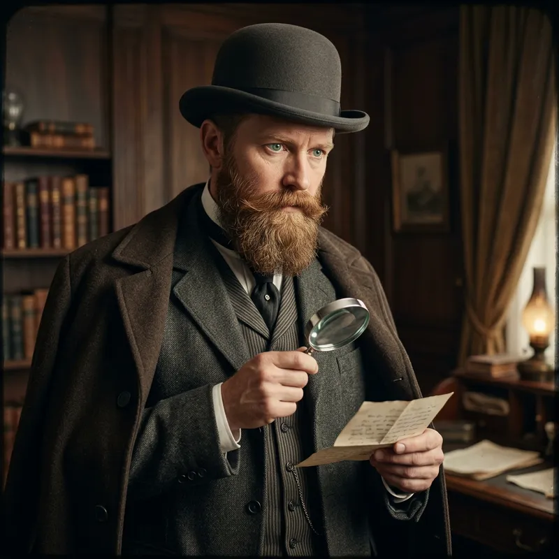 A nordic looking male detective from the 1800s, dressed in period-appropriate attire. He has bright, intelligent eyes and sports an impressive but well-groomed beard. In his hands he holds a magnifying glass, aiding him in his pursuit for truth and justice.