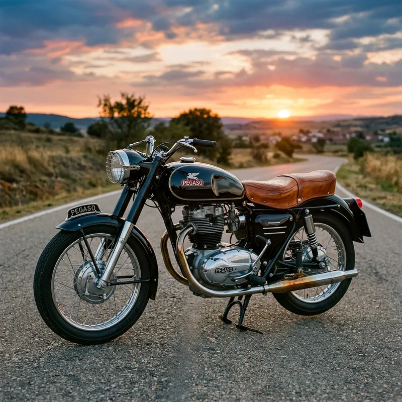 An intricately detailed image of a Pegaso bike. The motorcycle should exhibit a vintage aesthetic, reminiscent of mid-20th century designs. The body is a deep, glossy black, while the chrome accents glimmer with a brilliant shine. The polished leather seat adds a touch of elegance to its rugged charm. The bike is parked on an empty road, with a sunset painted in hues of orange and pink as a beautiful backdrop.
