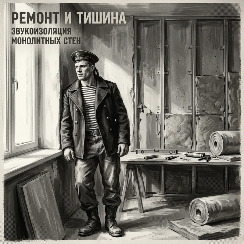 A digital painting styled with vintage prints, chiaroscuro lighting, and soft brush strokes. This artwork showcases a tall, muscular, and handsome young Russian builder. He is outfitted in a sailor uniform along with a traditional seafaring headdress. He is situated inside a modern, high-tech apartment undergoing an extensive renovation. Intricate details provide insight into the process of soundproofing the monolithic walls. The scene is cast in a beautiful light coming from the window. This is all depicted in a black and white palette, effectively lending the atmosphere of a vintage poster.