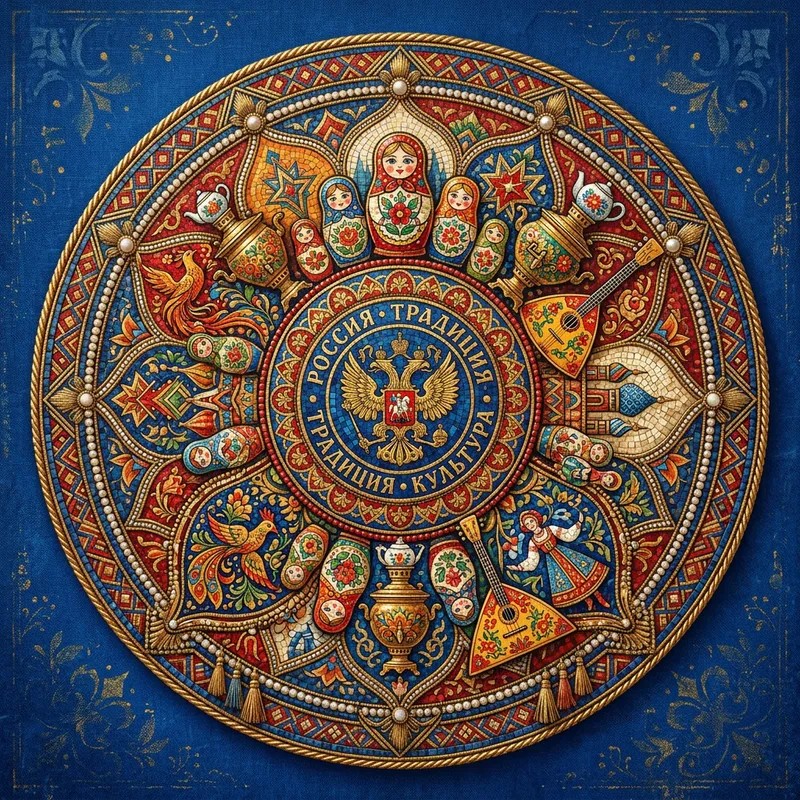 A rosette emblem bursting with intricate Russian design elements, embedded with traditional symbols such as folk motifs, samovars, balalaikas, and Matryoshka dolls. The design showcases a fusion of geometric shapes, vibrant colors, and elaborate patterns, reminiscent of a detailed mosaic. The background is a bright contrasting hue, making the elaborate rosette stand out prominently. The overall aesthetic has a vintage feel, reminiscent of antique Russian artifacts, yet is presented in a new and refreshing way.