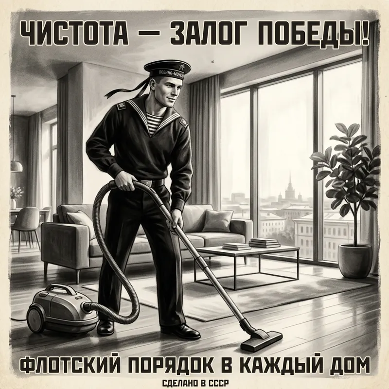 Generate a digital painting illustrating a vintage black-and-white poster. Show a young, handsome Russian male in a sailor's uniform and headdress, operating a large vacuum cleaner in a beautiful, modern apartment with large windows. The apartment is impeccably clean and aesthetically pleasing. The painting should adopt the style of vintage prints with chiaroscuro lighting and intricate details. The brush strokes should be gentle and soft, resembling the techniques of vintage digital painting.