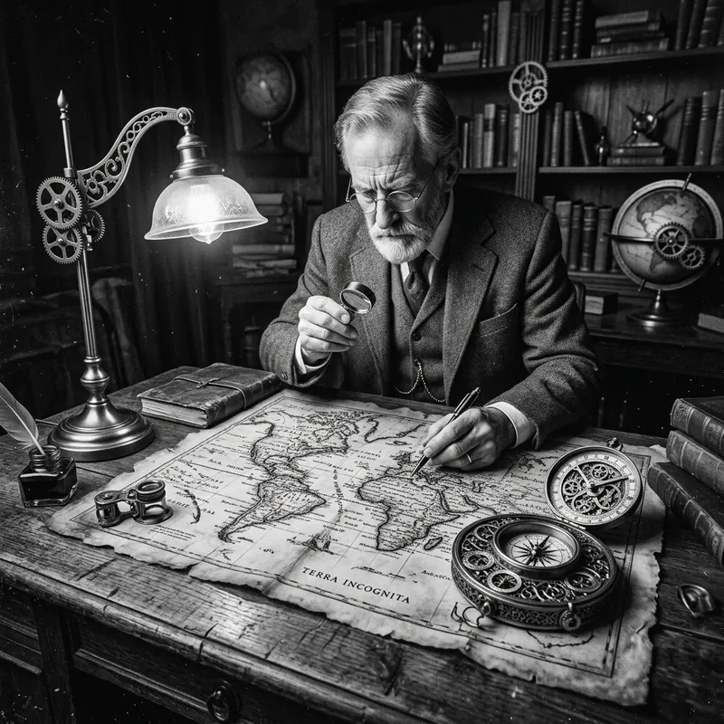 A distinguished gentleman, sporting a tailored suit, is engrossed in studying an ancient map, which is spread across a grand oak table. The scene is captured as if it's a vintage black and white photograph. The low-light setting selectively illuminates the scene, casting dramatic shadows that emphasize the man's focused expression. The atmosphere is imbued with the spirit of adventure and exploration. Through a wide-angle lens-akin feature, the meticulous details of the compass and the weathered edges of the map are captured. Under a motif influenced by the steampunk venture, gears and intricate details adorn the compass and table, providing a captivating portrait of a scholarly explorer deeply engrossed in his quest for discovery.