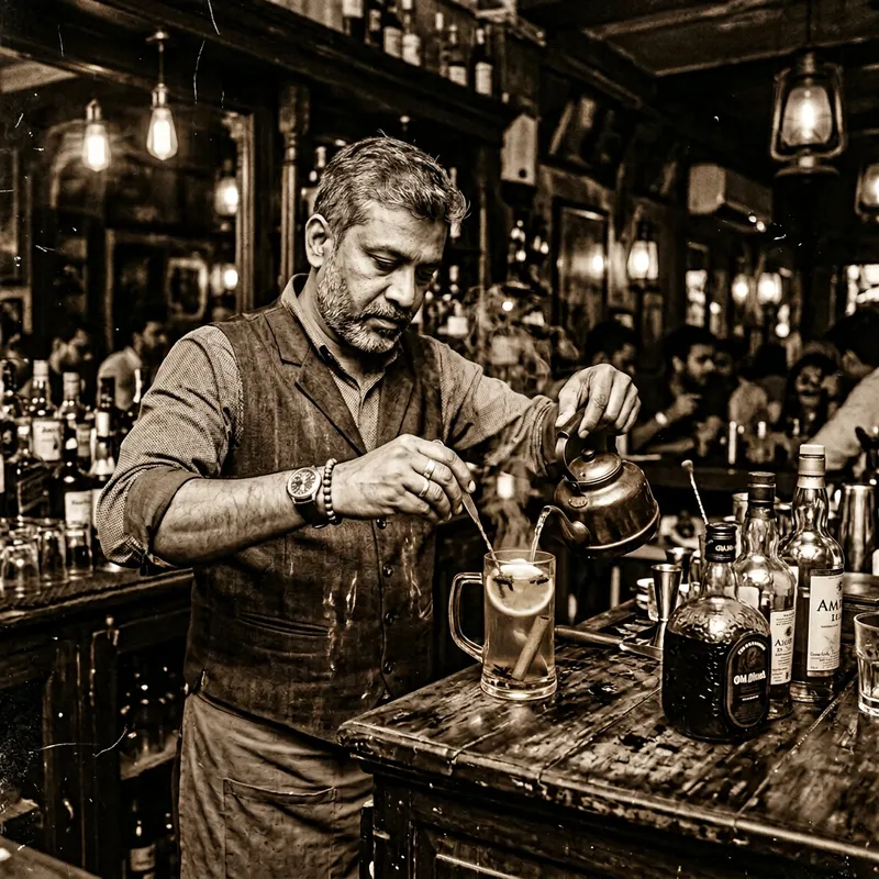 Depict a middle-aged South Asian man, adeptly working as a bartender behind a rustic wooden bar. His expert hands skillfully mix a piping hot toddy. The scene is to be obtained from the perspective of a vintage film camera, resulting in a sepia-toned photograph that hints at nostalgia. Make sure to retain the moody atmosphere, characterized by low lighting that accentuates the deep shadows and highlights the gleaming glass of the hot toddy. Moreover, incorporate a subtle film grain effect to enhance the vintage aspect of the image. The overall theme must reflect the rich cocktail culture.