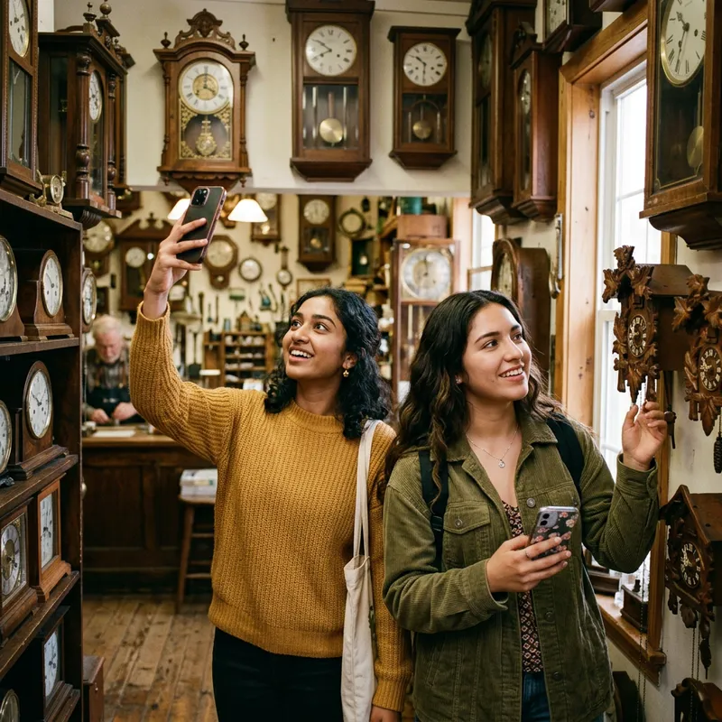 A captivating scene of a quaint vintage shop known for its assortment of antique clocks. In the shop are two modern women in their late teens, one of South Asian descent and the other of Hispanic descent. They are observing the clocks with wide-eyed wonder, their smartphones in their hands, perhaps ready to document the quaint beauty of the vintage timepieces. The shop's ambience is homely and welcoming, filled with the dainty ticking of numerous clocks and the faint smell of polished wood.