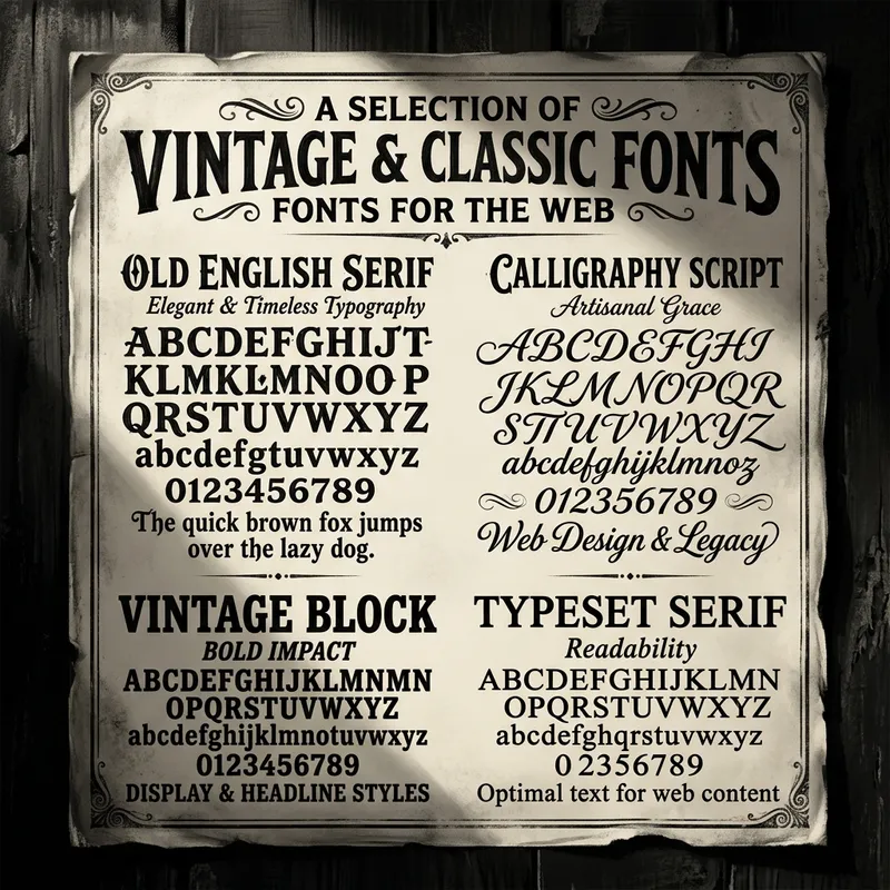 Digital painting of a selection of fonts for a website, made in a vintage style reminiscent of old prints. The image is black and white, highlighted by chiaroscuro lighting that casts dramatic shadows and gives depth to the intricate details of the fonts. Soft brush strokes are used in rendering the poster, further enhancing its vintage feel.