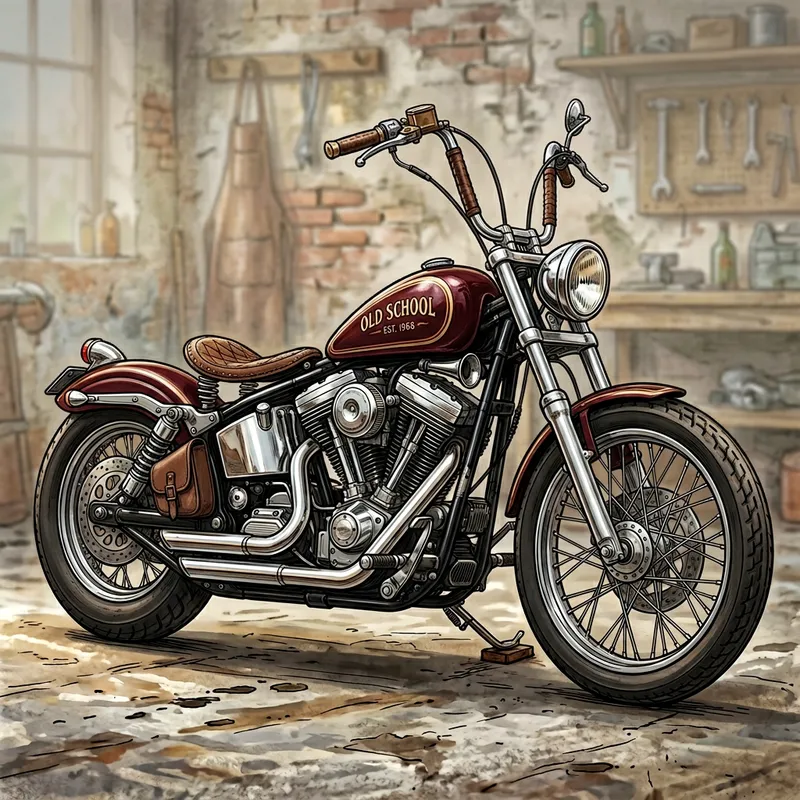 A detailed digital illustration of a vintage-style motorcycle, commonly referred to as 'old school'. The motorcycle is designed with a classic aesthetic, featuring chrome finishes and leather details. The background is simple, highlighting the beauty and style of the motorcycle.