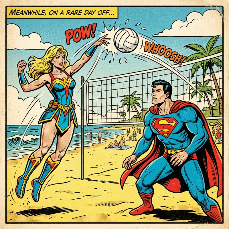 A beach scene featuring two mythical, superhero-like figures. The first is a blond, athletically built female superhero, donned in a brightly coloured warrior costume, sprinting, with a volleyball in motion, her body language suggesting a powerful serve. The second figure, a muscular male superhero with black hair and a distinct 'S' emblem on his chest, takes an agile stance, ready to return the serve. Their dynamic poses and outfits, coupled with the simplistic graphic detail and vibrant colours, heighten the overall energy and convey the nostalgic feel of vintage comic books.