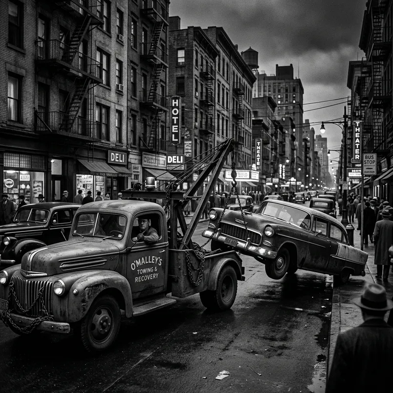 Vintage Tow Truck & Classic Car in City Noir Photography