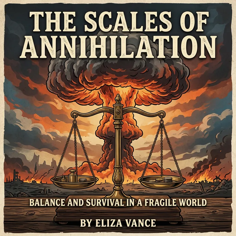 Imagine a 2D graphic for a book cover that differs greatly in its elements. In the foreground, you see a set of vintage trading scales, symbolizing balance and fairness. It's delicate and classical structure stands out acutely against the backdrop. In the background, a stark contrast presents itself with a daunting nuclear mushroom cloud billowing upwards, its immense power and destruction filling the rest of the cover. These two elements together create a thought-provoking and visually striking juxtaposition.