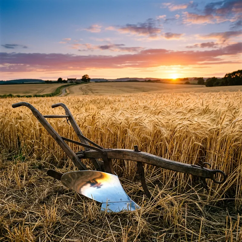 A vintage wooden plow in a golden wheat field. The plow, with its sharp, high gloss metal blade, is parked in the foreground. Sunlight gleams off the blade, casting a bright reflection. Behind it, endless rows of tall, ripe wheat sway gently in the wind, with their golden stalks contrasting against the deep blue sky above. The wheat stalks are heavy with grains, bowed under their weight. In the distance, a sun is setting, painting the sky with shades of orange, pink, and purple. The peaceful rural landscape encapsulates the beauty and tranquility of the harvest season.