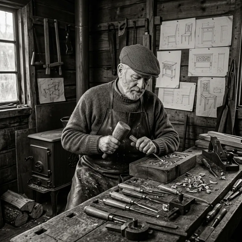 A monochrome depiction of a manually operated vintage workshop. Within it, a skilled craftsman of Caucasian descent is meticulously hand-carving intricate designs into a piece of aged wood. His clothing harks back to earlier times, a leather apron and a flat cap, suggesting an old-school charm. Surrounding him are well-worn tools of his trade, each telling their own stories of dedication and hard work. Pinned on the wooden walls of the room are sketched masterpieces, serving as inspiration. The image embodies the phrase 'Master your craft, old school charm'.