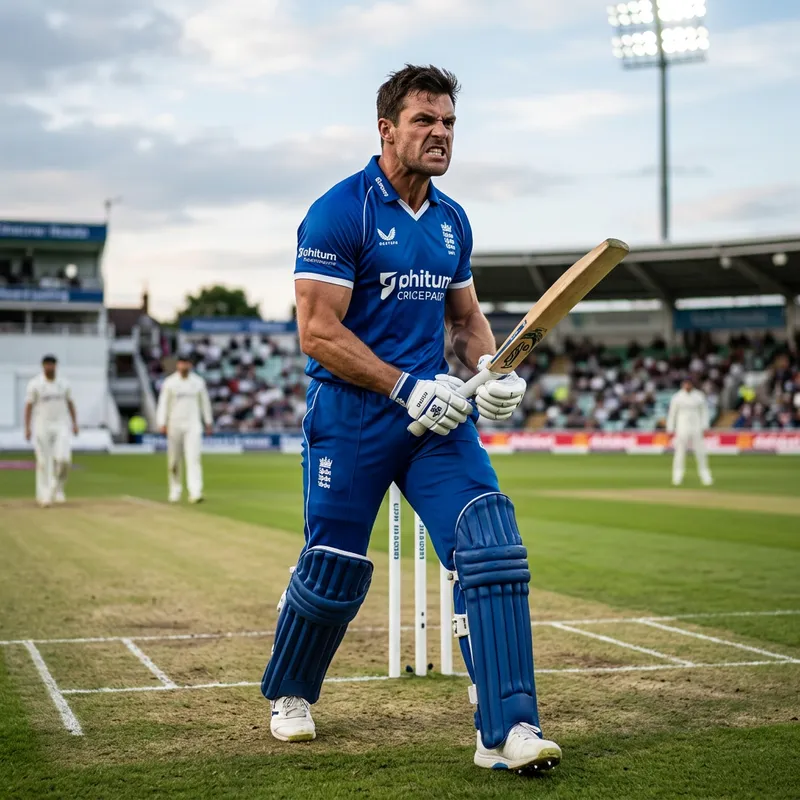 An angry cricketer with a muscular build and dark brown hair on a cricket ground. He's wearing a blue cricket uniform, holding a bat, and has a serious, intense expression on his face reflecting his determination.